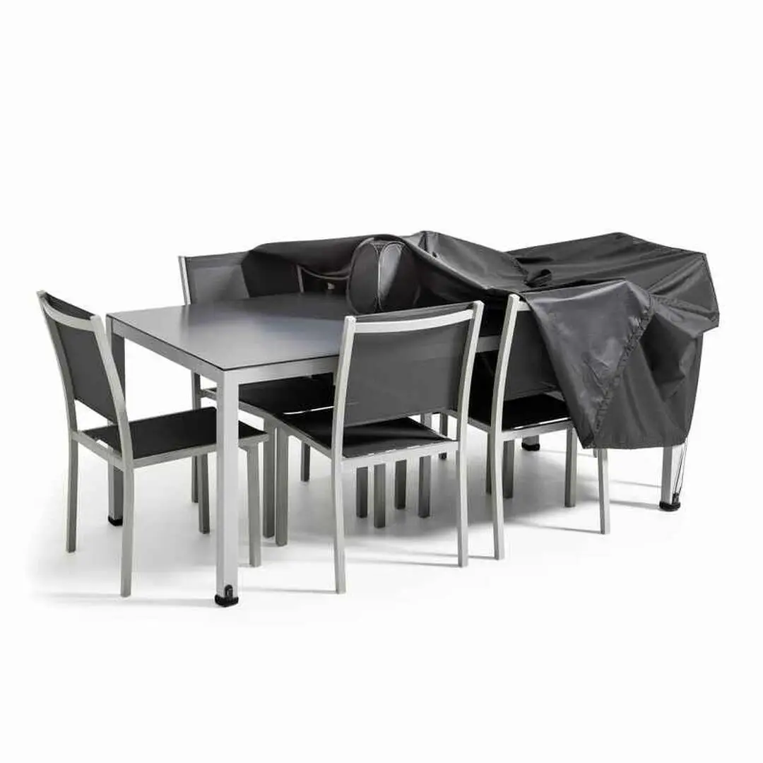 La housse de table de jardin rectangulaire possède 2 scratchs de fixation anti-vent pour qu’elle ne s’envole pas ainsi qu’1 cordon de serrage pour un ajustement parfait de la housse au mobilier et 1 valisette de rangement.